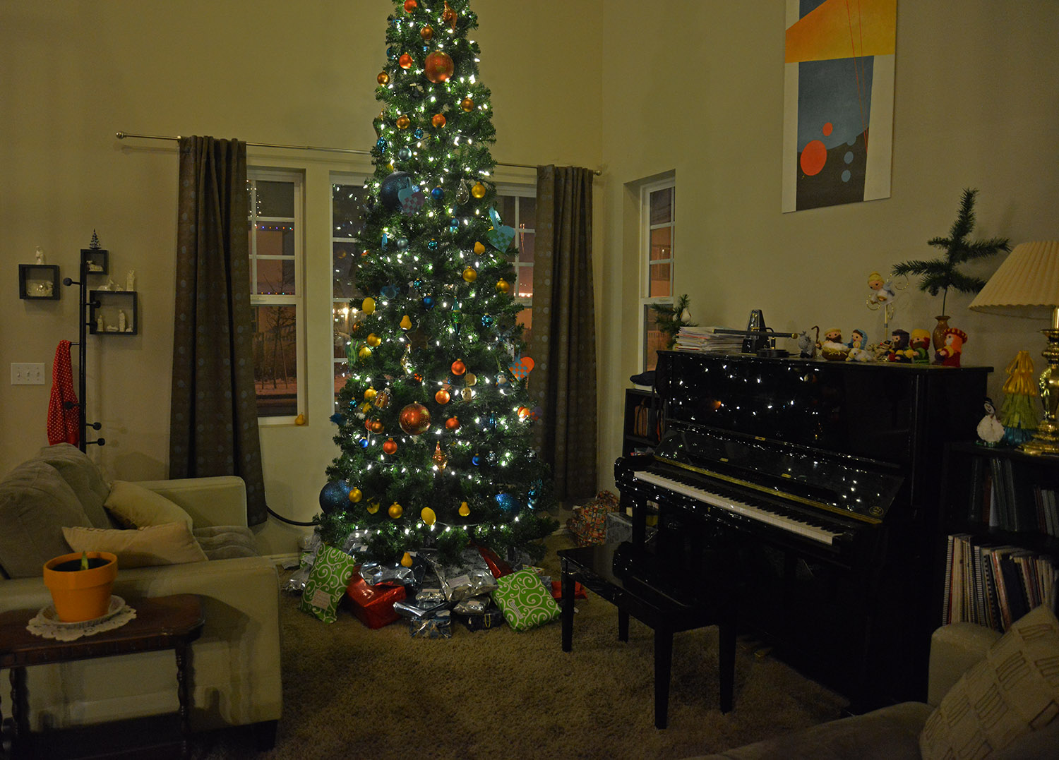 And then we watched the Tabernacle Choir broadcast, and the kids went to bed, and here was the tree and the clean house as I at last went up to bed myself. All glowing and magical, as it always is on Christmas eve.