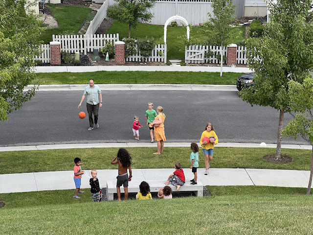 Family Home Evening on the hill. Sam made up a bocce-type game and a bunch of neighborhood kids wanted to join in