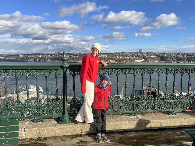 That first morning, we walked around the Chateau and Old Quebec with Andrea's family, and then we told Malachi to come with us and go pick up some lunch. Then we drove to the airport and instead of lunch, picked up Evan! Malachi was very surprised and very happy! It was fun to see him switch into "tour guide and explainer of Quebec" mode, and even sound enthusiastic about things, as he showed Evan around. It was funny because at the airport, Evan just came out and got into our car, and then he and Malachi were laughing and catching up, and then Clementine suddenly said quietly and suspiciously from her car seat, "Why did this boy get into our van?" It was a valid question!