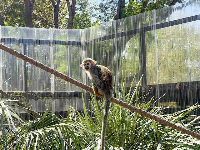 And my favorite were the monkeys! (For Seb, I guess, but I like monkeys too! I have come to love all the animals my kids love.) It was so cool here because you could go right into the enclosure with the spider monkeys! You go through a double set of doors kind of like when you're going into an aviary or a butterfly enclosure. And some zookeepers tell you not to hold your hand out to the monkeys and so forth. And then you get to just go in and wander around right by them, as they run across ropes and climb trees just over your head! It is really fun!